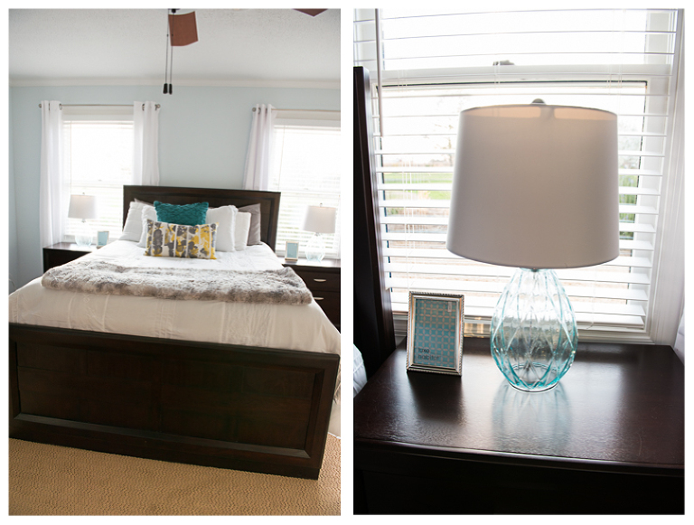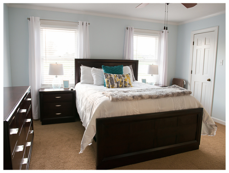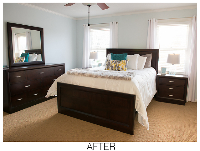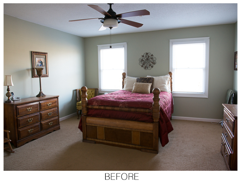 Last summer my husband Nick and I moved into our “forever house…a.k.a “Honey we are living in this house forever because I am never moving again!” All kidding aside, we bought our house because we loved its short and long term potential. It’s within walking distance to Jackson’s elementary school, it has a nice open floorplan, a huge kitchen, awesome his and her walk-in closets and a large two acre lot perfect for all the gardening we could ever want to do. The only drawback is it’s 1970’s roots. The former owner updated a lot of things, but not quite to our taste. We are the DIY-weekend-project type so we love the possibilites and reward of giving our place a little love room by room. We have done a few mini-makeovers, like painting the fireplace and putting nice flooring in my small room of a closet, but the master bedroom is the first room that has gotten a major overhaul. I am SOOOO happy with the results. Every time I walk in the room, it makes me smile. It is so light and bright and relaxing- everything a master bedroom should be. Check out the before and after and see for yourself.
